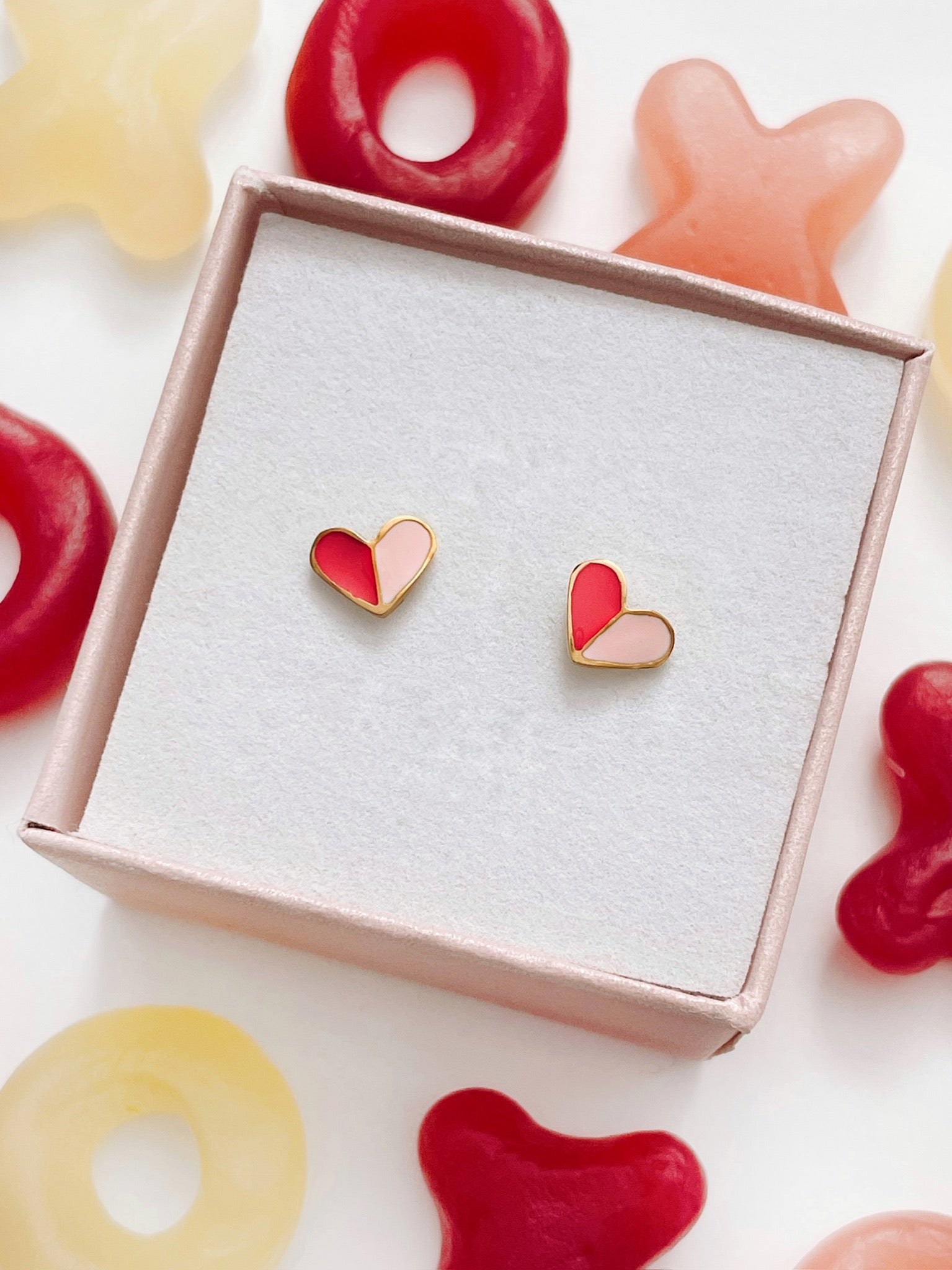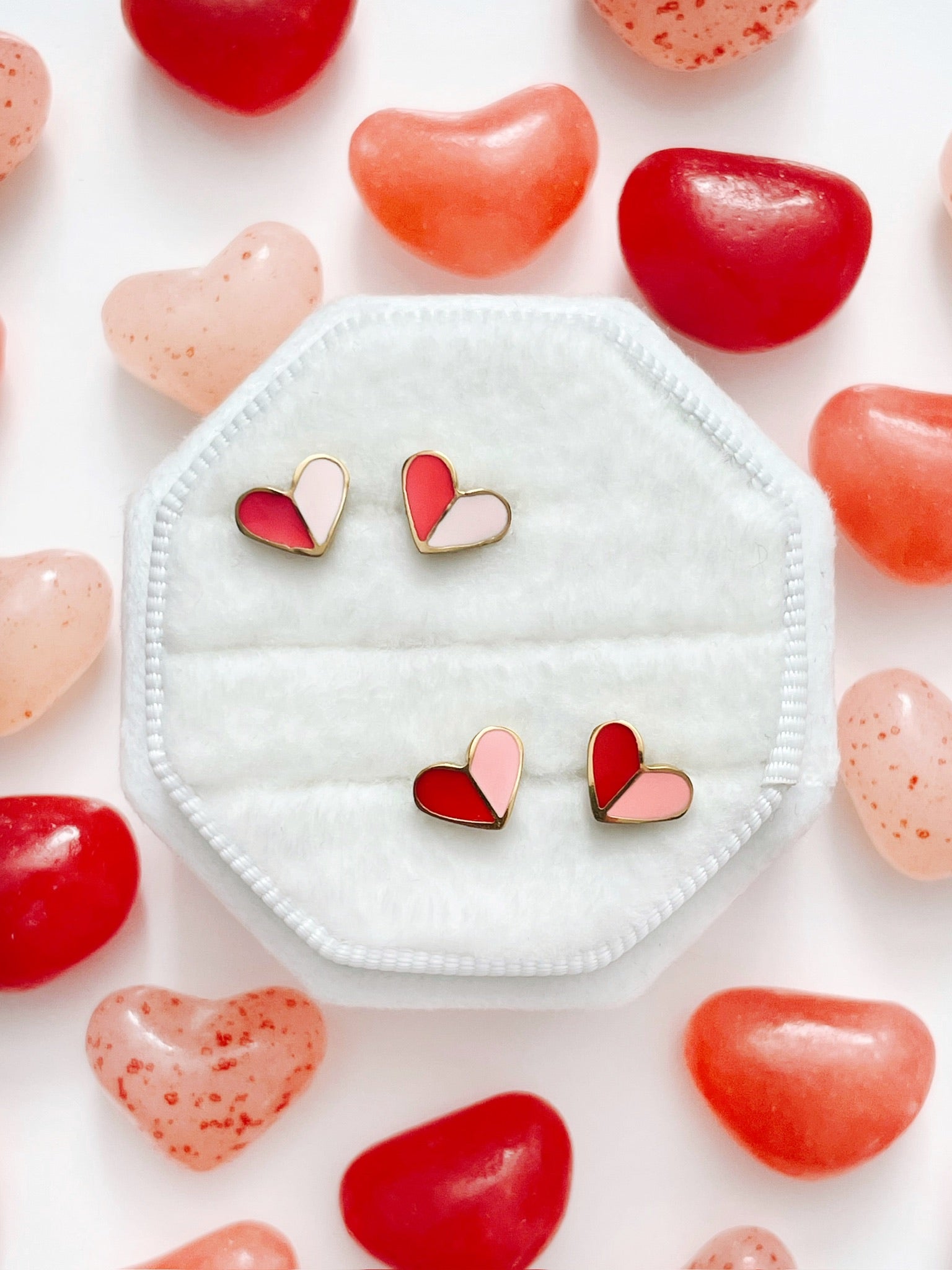 These sweet screw-back earrings feature a half-and-half heart design for a fun pop of color. Designed with secure screw backs for comfortable, all-day wear. NOW available in two playful color combinations: Hot Pink & Light Pink or Red & Pink. Perfect for adding a little love and color to any outfit.