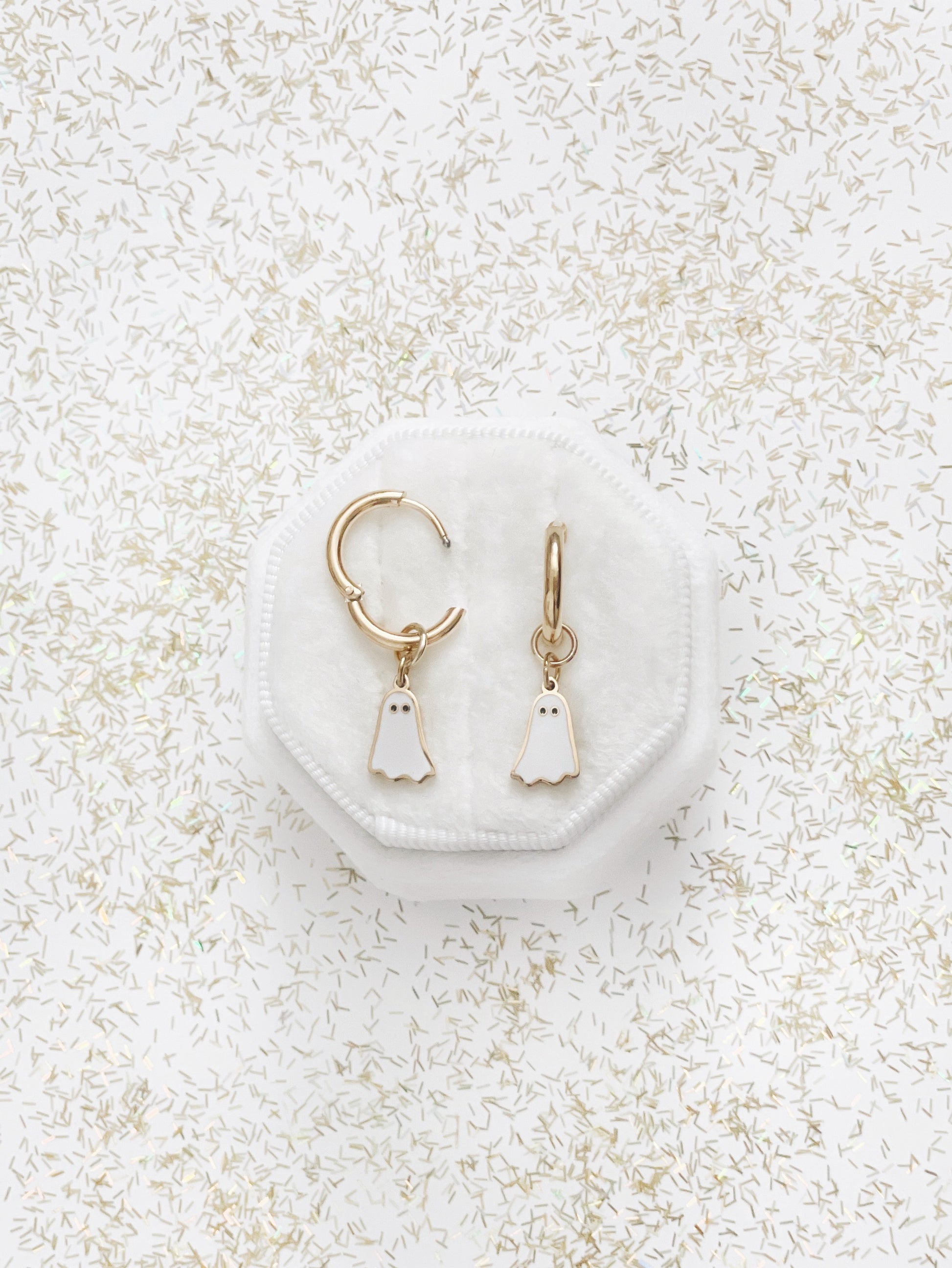 Boo-tiful and charming! These white ghost charm earrings add a playful Halloween twist to your everyday look. Designed to hang from sleek Huggie hoops, they’re the perfect mix of spooky and sweet — lightweight, comfy, and ready to haunt your fall outfit in the best way.