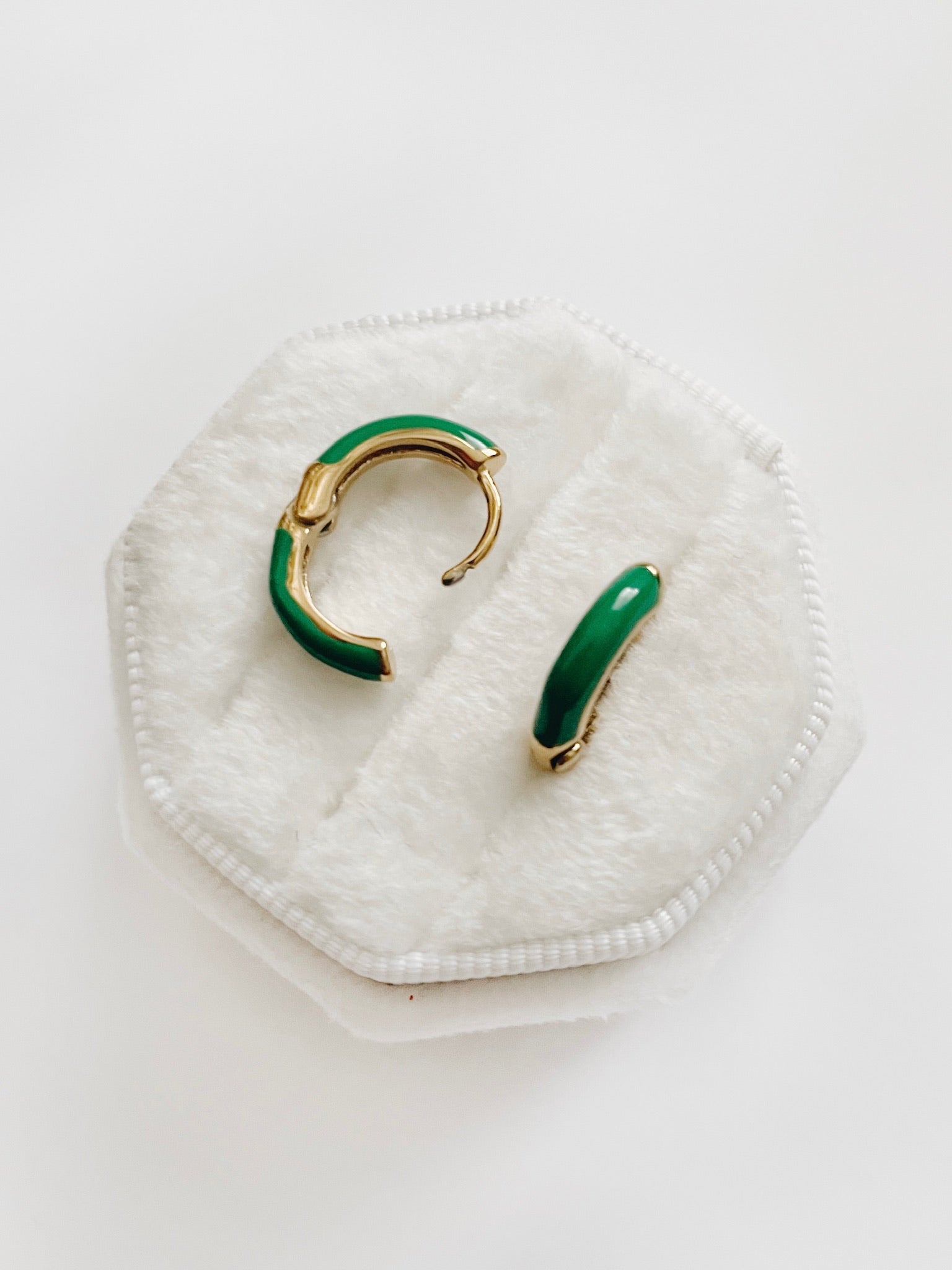 A little holiday cheer in a perfect hoop! These glossy green enamel earrings add a festive pop to any outfit. Light, easy, and available in gold or silver plating—your new go-to holiday hoops.
