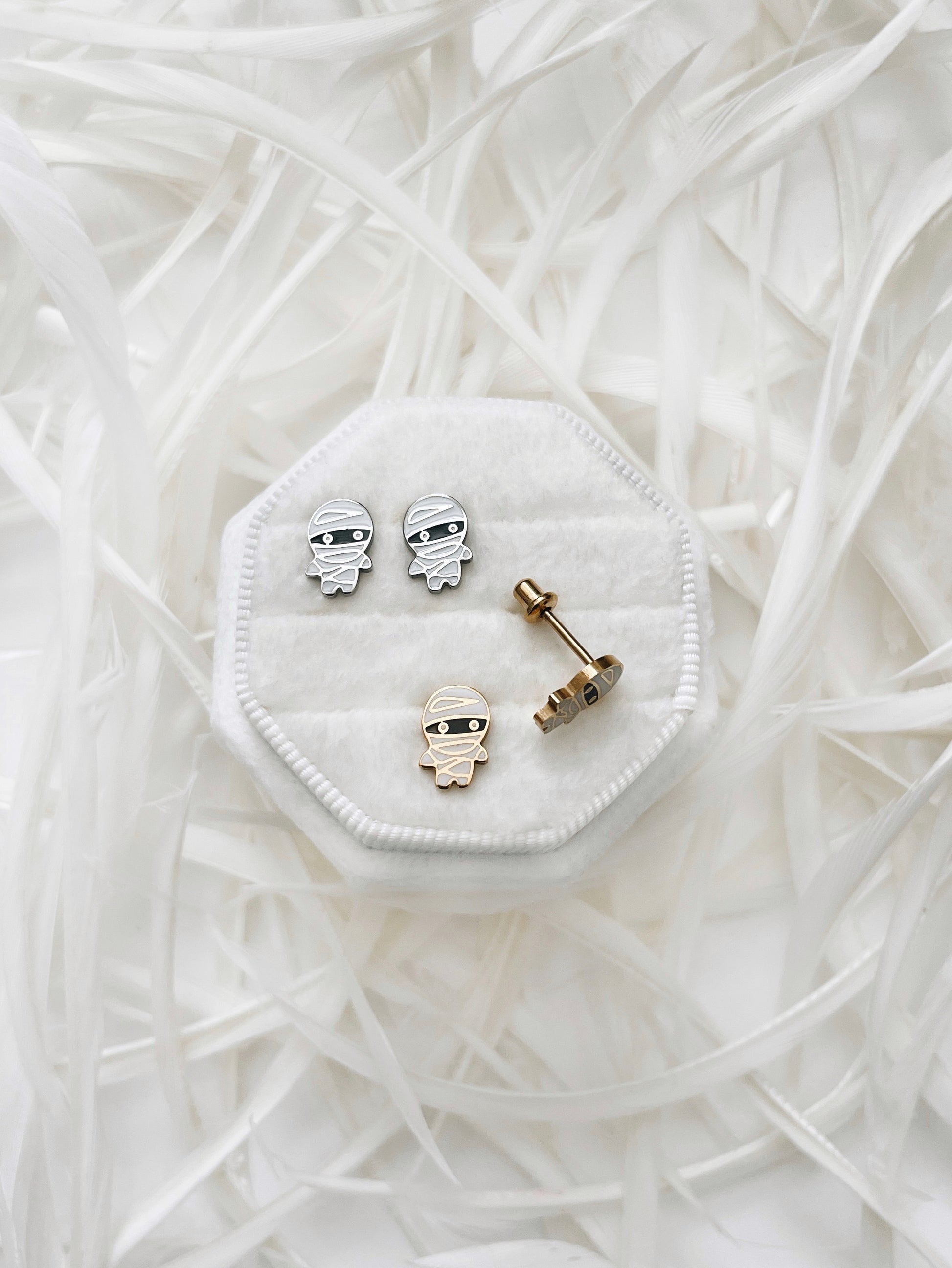 Wrapped, cute, and totally un-spookable! These mummy studs bring cozy Halloween vibes with a secure screwback fit you can wear all day (and all night).
