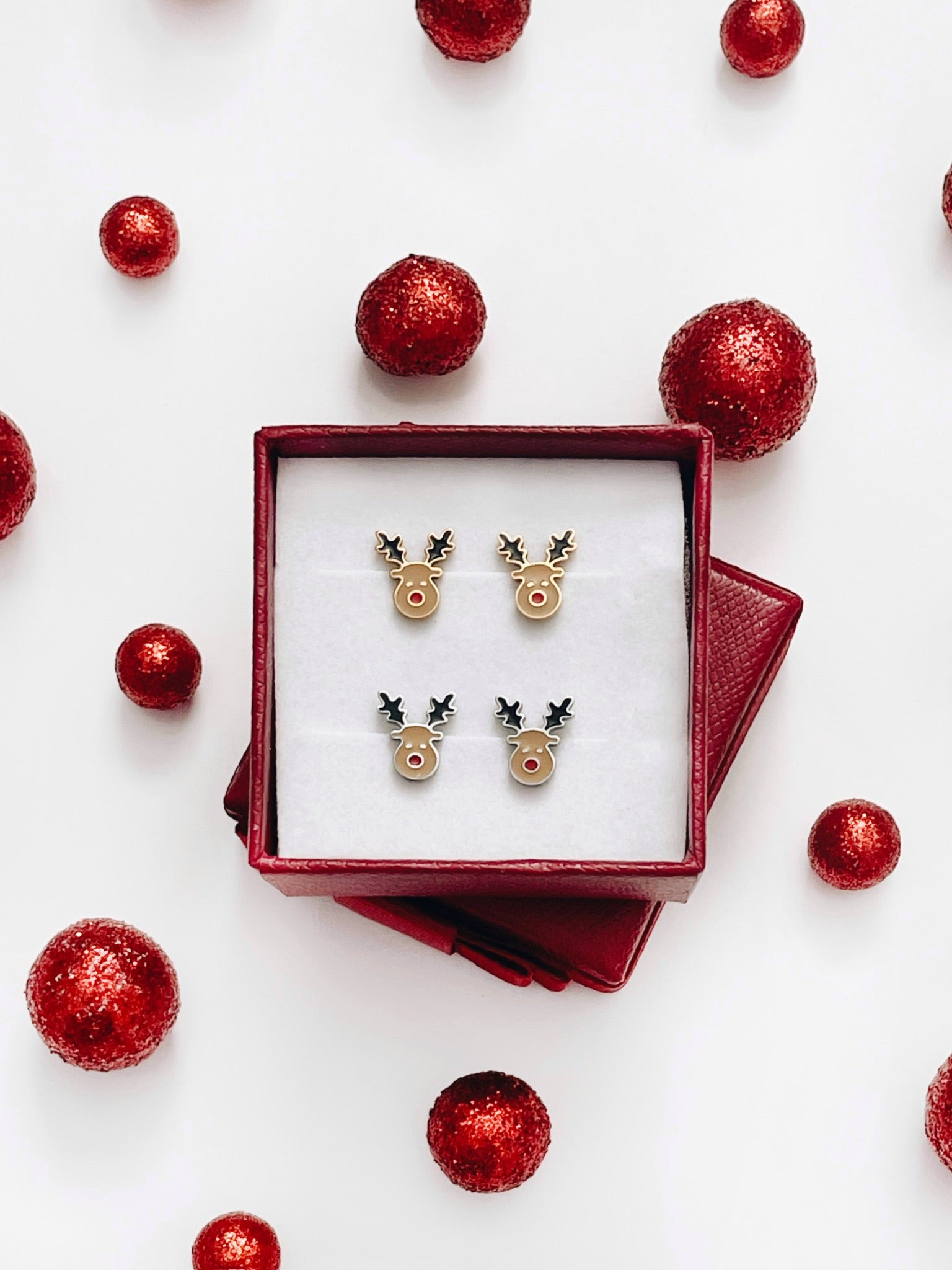 Say hello to the cutest holiday earrings ever! These Rudolph Reindeer Studs feature a sweet brown reindeer face with tiny antlers and a bright red enamel nose. With secure screw-backs for all-day comfort, they’re perfect for spreading Christmas cheer wherever you go.